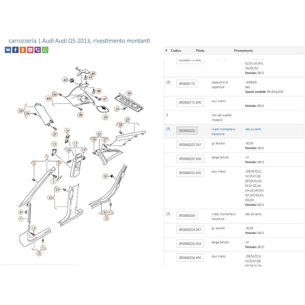 RIVESTIMENTO COPERTURA FODERA TAPPEZZERIA CENTRALE INTERNA LATERALE DX DESTRA AUDI Q5 SQ5 (8RB) [2013-2018] 8R0868204